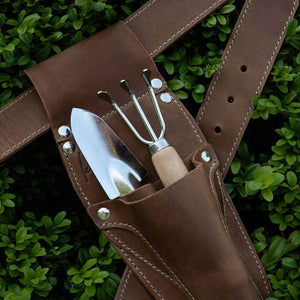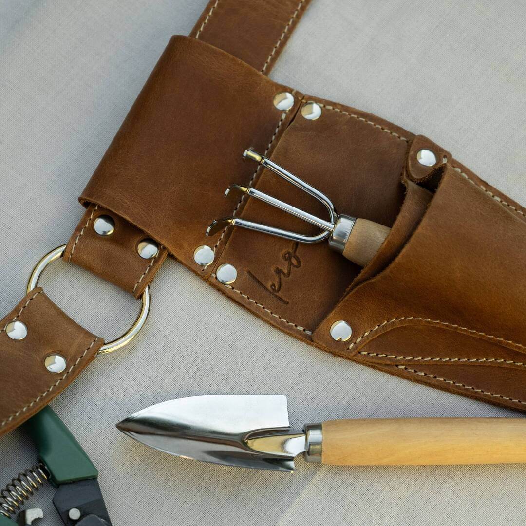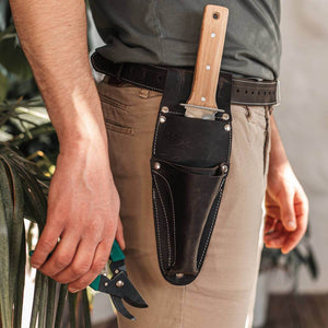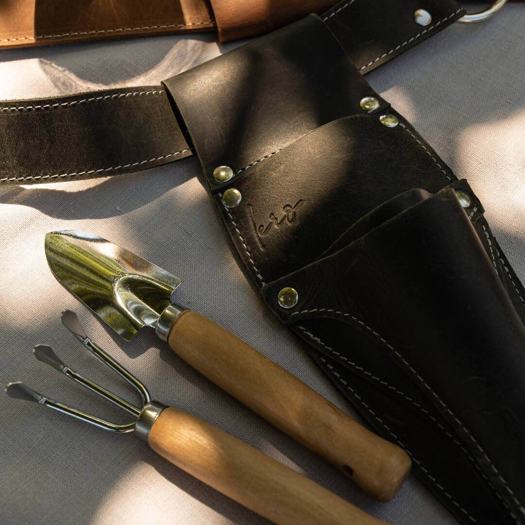 Gardening is a rhythm, and you shouldn't have to break it to find your tools. This apron belt keeps your Hori Hori, shears, and snips ready at your hip, allowing you to switch tasks instantly without walking back to the shed. The thick leather protects your legs from sharp blades, while the secure fit means you can bend, kneel, and move freely. It’s practical, professional gear that makes your time in the garden safer and more efficient.